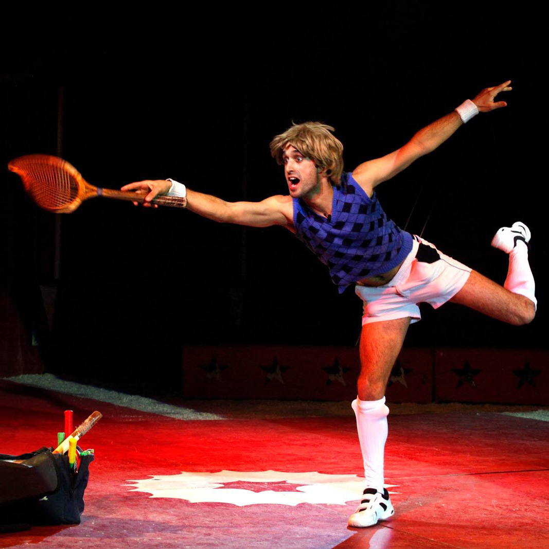 José Luis Redondo is an artist well known for the entertaining characters he plays in his own circus shows, which combine acrobatics and lots of humour. He is one of the artists who has participated most in CIRCADA in Seville, a leading event of its kind in Europe. In this show, he introduces us to Ricky, the tennis coach. He is blond, athletic, strong, fast, handsome, agile, flirtatious, famous. Or at least that's what he thinks. During the 1980s, Ricky was an elite and successful athlete: Wimbledon, US Open, etc. There was no tournament he couldn't win. But one fine day, an unfortunate doping test put an end to his career. Now he is a very peculiar tennis coach who gives master classes wherever the audience is willing to pay him a little attention, using his great sense of humour and circus techniques, with the sole aim of rediscovering the love that his beloved audience gave him.
