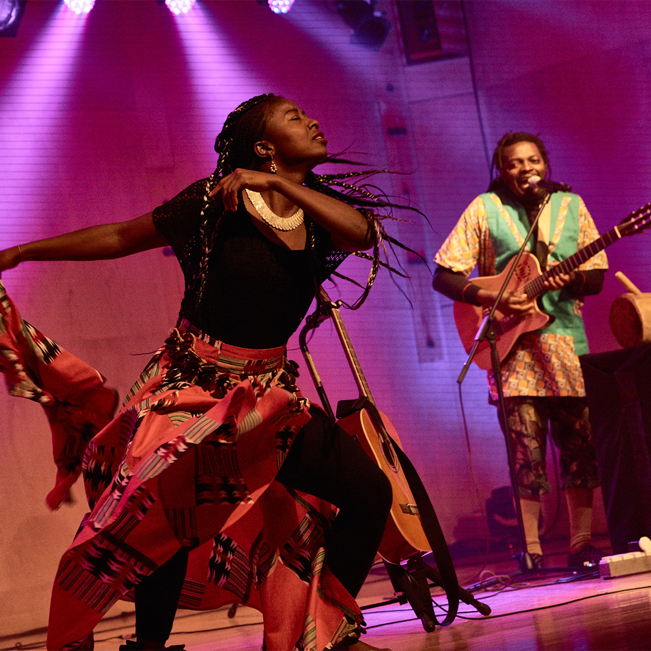 Lornoar is one of Cameroon's great female voices. A singer, composer and guitarist, her music is rooted in the Eton tradition and open to contemporary sounds such as soul, jazz, funk and Afro-pop. Her powerful and expressive voice conveys emotion, spirituality and commitment, captivating audiences on stages around the world. Michel Mbarga is one of the most renowned guitarists in Central Africa. A virtuoso of bikutsi and a profound connoisseur of traditional Cameroonian music, he plays electric and acoustic guitars, balafon and nkul, combining technique, rhythm and sensitivity in an unmistakable personal style. In this exceptional concert, Lornoar and Michel Mbarga unite their artistic universes to guide the audience on a musical journey through the tropical rainforests of Cameroon, in the heart of Africa. Surrounded by a group of highly skilled instrumentalists, they create a richly nuanced sound experience, where oral tradition, ancestral rhythms and contemporary languages coexist naturally.